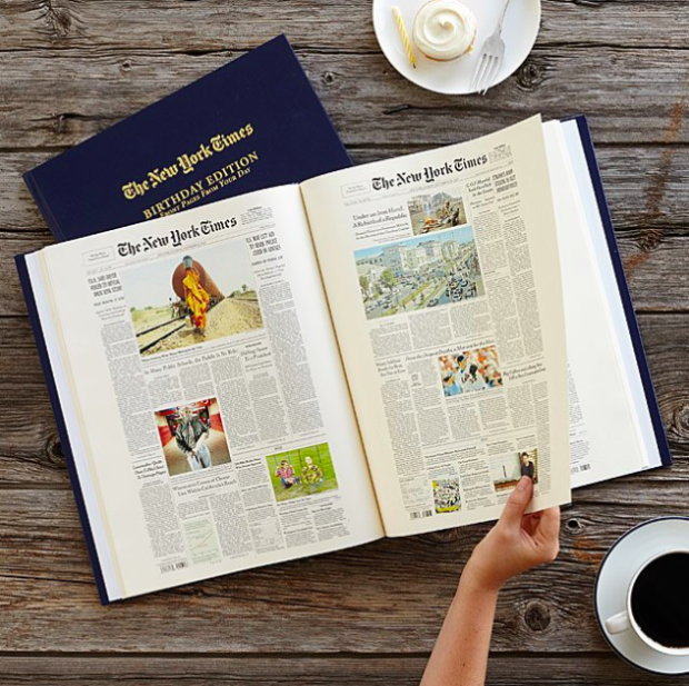 This New York Times birthday book has the front page from the day you were born, and the front page from your birthday for every year after. Historical ones are included too, adding up to between 72 and 110 pages of awesome. This comes with a certificate of authenticity.